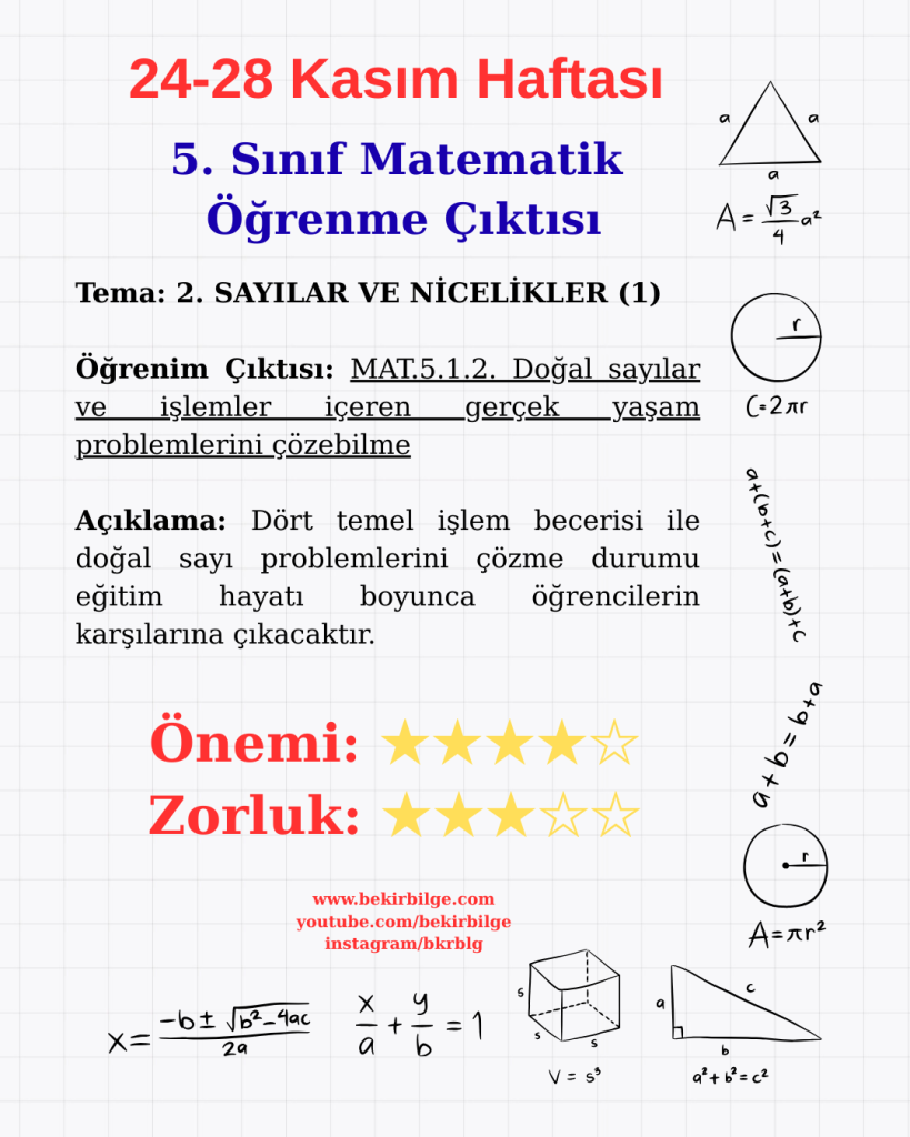 Açıklama: Dört temel işlem becerisi ile doğal sayı problemlerini çözme durumu eğitim hayatı boyunca öğrencilerin karşılarına çıkacaktır.