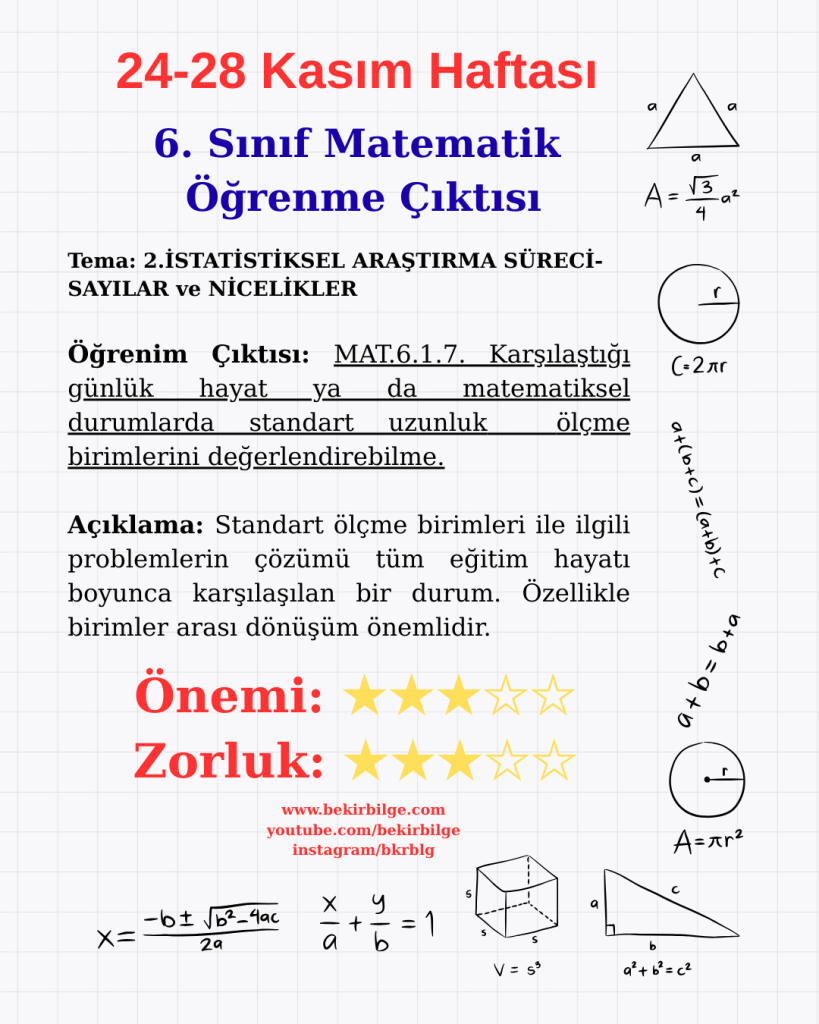 Öğrenim Çıktısı: MAT.6.1.7. Karşılaştığı günlük hayat ya da matematiksel durumlarda standart uzunluk ölçme birimlerini değerlendirebilme.