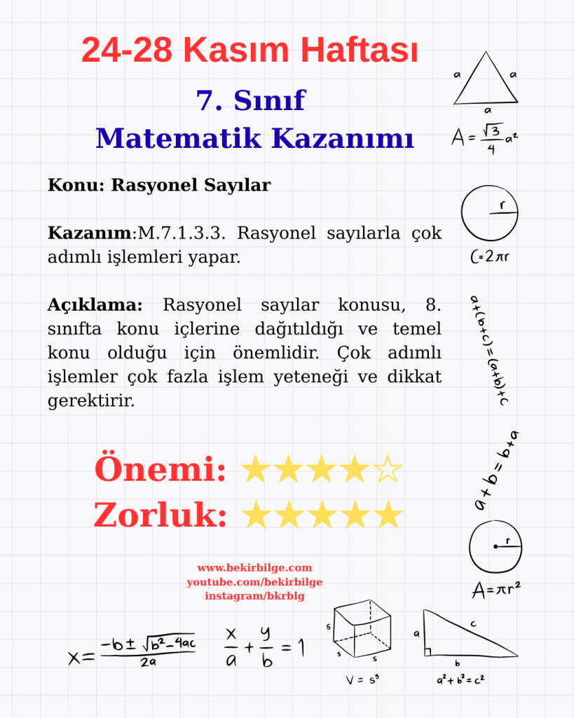 Açıklama: Rasyonel sayılar konusu, 8. sınıfta konu içlerine dağıtıldığı ve temel konu olduğu için önemlidir. Çok adımlı işlemler çok fazla işlem yeteneği ve dikkat gerektirir.