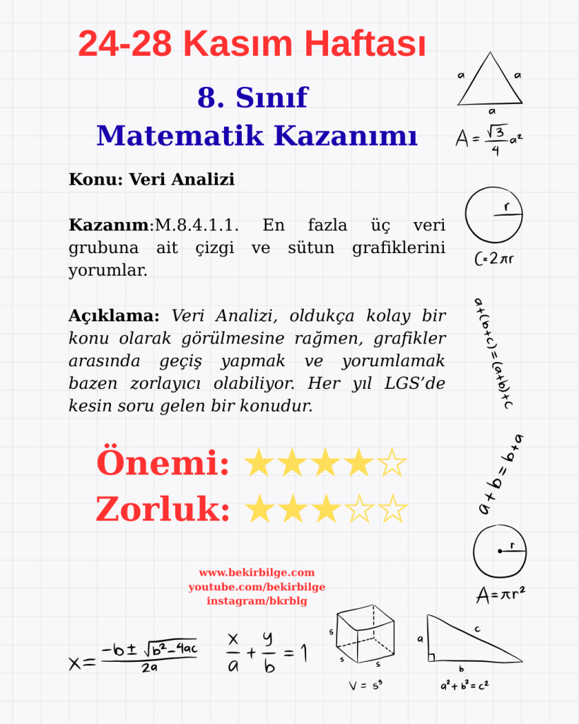 Açıklama: Veri Analizi, oldukça kolay bir konu olarak görülmesine rağmen, grafikler arasında geçiş yapmak ve yorumlamak bazen zorlayıcı olabiliyor. Her yıl LGS’de kesin soru gelen bir konudur.